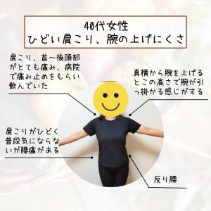肩こりがひどく、チェックしてみると腕は上げられるが途中で引っ掛かったりしてスッと上げられない状態。