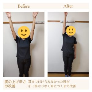 約3か月でここまで改善しました。腕の上がりのスムーズさも継続しています。(改善ペースは個人差あります)