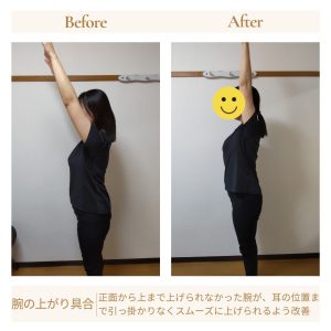 途中施術間隔が空いたりはしましたが、腕は引っ掛かりなくキレイに上まで上がるようになりました。